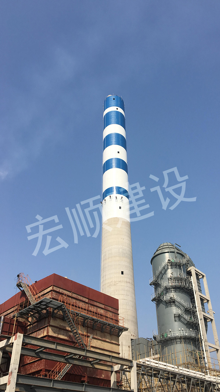 2、煙囪的表面處理是確保一個適當涂料施工和涂料附著力的關鍵步驟;“清潔”主要目的是清除表面的灰塵,鐵銹等.涂裝時增加底材和涂料的層間附著力。煙囪表面清采用人工和機械相結合的方法進行除銹,鋼絲刷、鏟刀等工具將煙囪表面浮塵、污垢等附著物清理干凈,基面必須干燥,在深度為20mm的厚度層內,含水率不應大于6%方可進行涂層施工。煙囪航標按5米一節,分段涂刷,顏色為紅白相間,最上一節與最下一節都為紅色,航標色環為單數。涂刷時紅白界線應分明,不得出現鋸齒等現狀,涂刷時不得將不同油漆滴入航標內。涂刷應均勻美觀,并做到不掛流、不漏涂、不誤涂、無針孔、無明顯皺折現象。涂刷時應保持每遍涂層的厚度和漆膜總厚度,其漆膜總厚度不應小于160um。嚴格按照產品說明書和行業規范進行施工。嚴格按照產品要求配比均勻。陰雨、重霧等天氣應停止施工,待天氣晴朗符合施工要求再進行施工。
