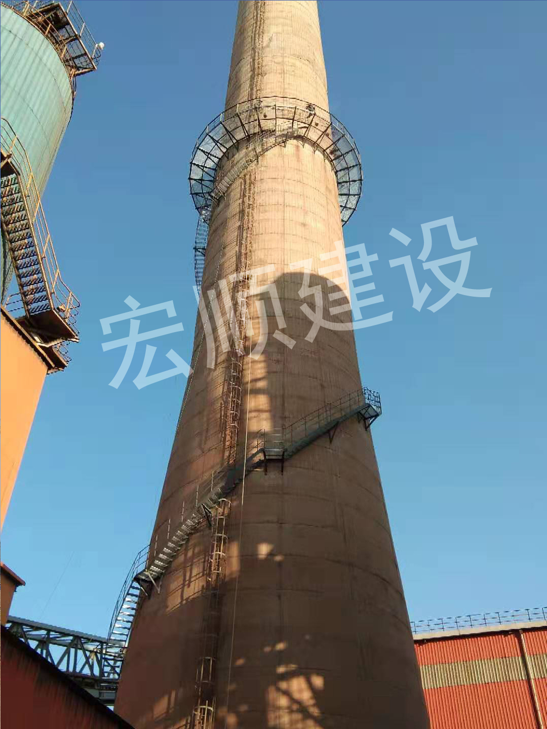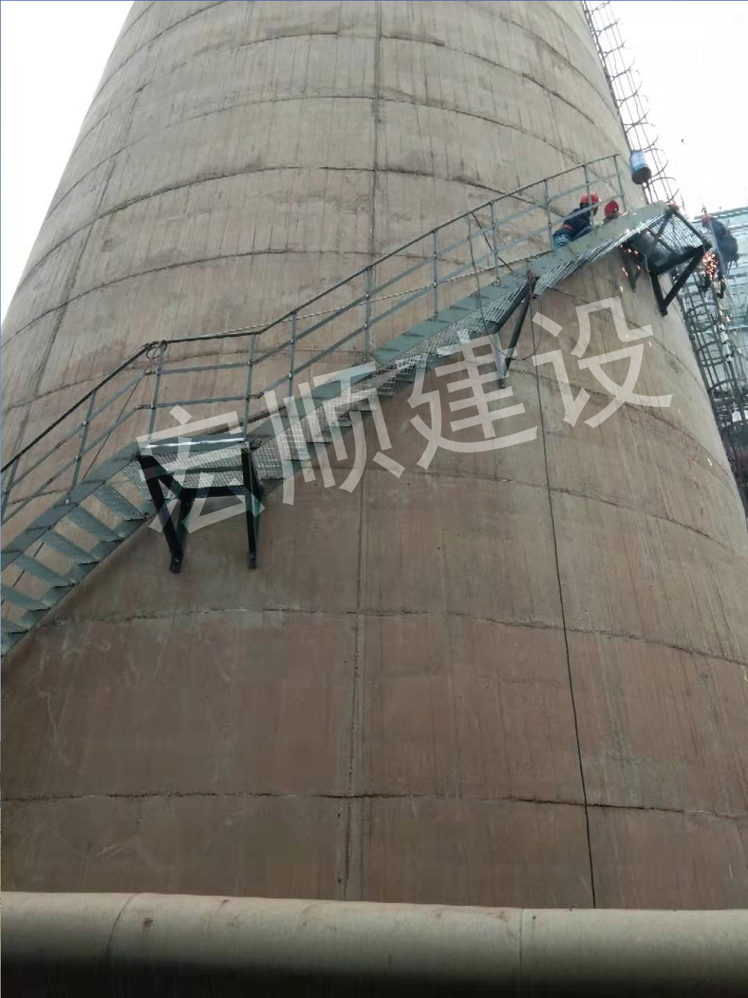 對(duì)120米煙囪身從下向上依次焊接安裝,將第一塊踏步板焊接在囪身后,就依第一塊板為作業(yè)平臺(tái)依次向上逐步焊接安裝。同時(shí)準(zhǔn)備兩臺(tái)焊機(jī),一臺(tái)焊接負(fù)責(zé)焊接安裝踏步板,另一臺(tái)負(fù)責(zé)焊接欄桿及加固用。在焊接安裝平臺(tái)時(shí),先將平臺(tái)三角支撐焊接固定在囪身,后再鋪焊平臺(tái)板。對(duì)踏步板、平臺(tái)及欄桿等焊接處進(jìn)行油漆防腐。